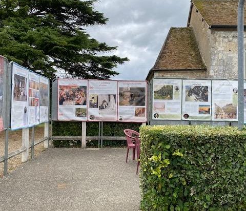 Exposition expliquant le parcours impressionniste sur la terrasse du Café de la Poste à Muids.
